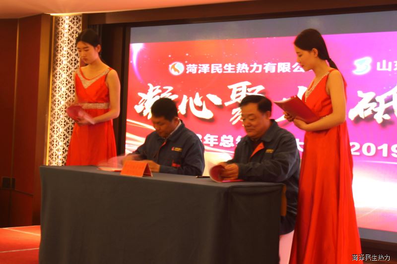 菏泽民生热力有限公司董事长闫正超分别与各公司总经理签订了“2019年度经营目标责任书”,经济目标责任书的签订,既吹响了今年工作的号角,也表明了目标和责任的承担,使大家真正把指标作为工作目标,把压力作为工作动力,把责任作为工作使命,确保公司全年工作顺利开展。